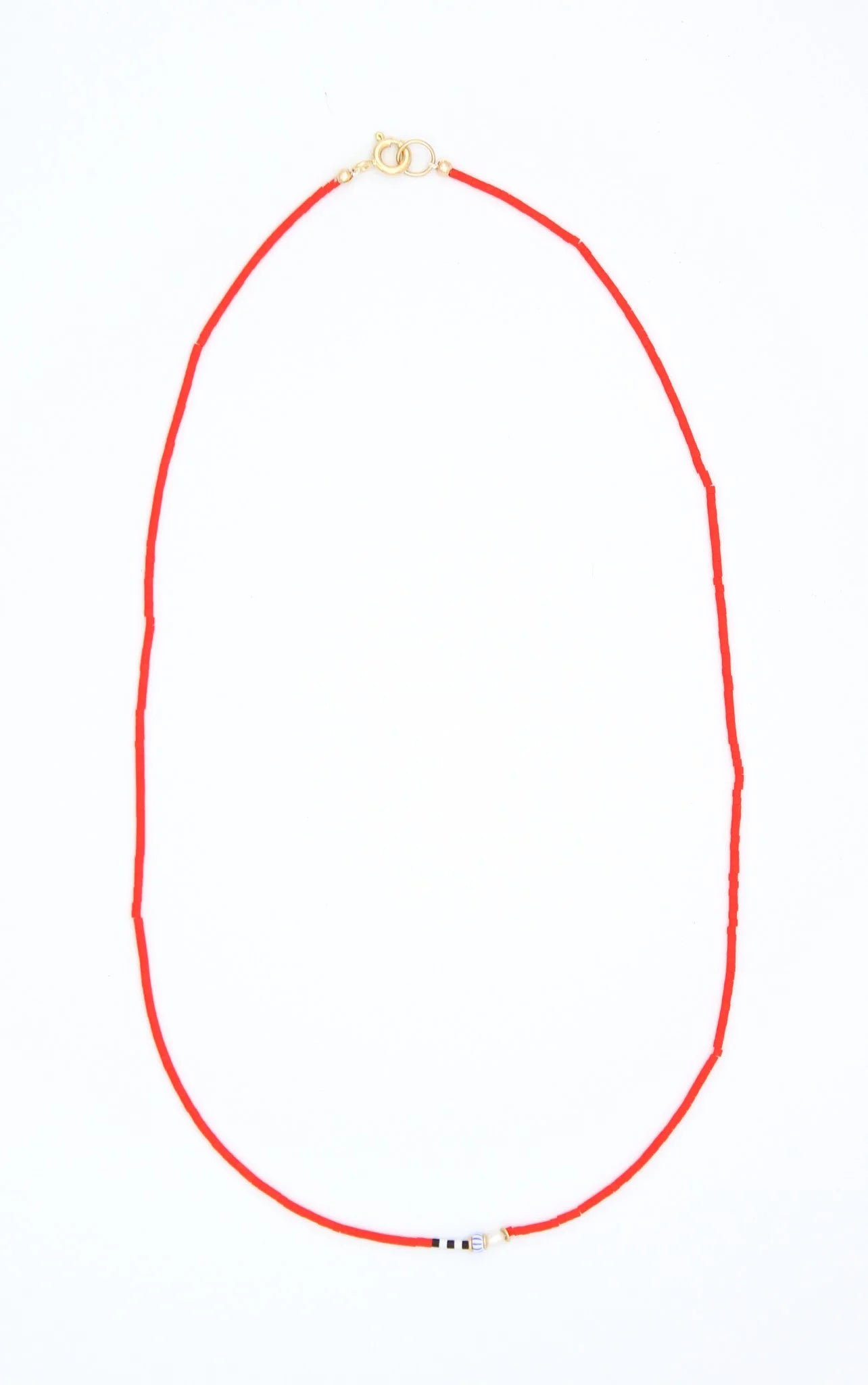 We added fun segments to our signature vermillion red necklace. Pops of black and white, blue and white and freshwater pearl. Layer it or wear it on its own.